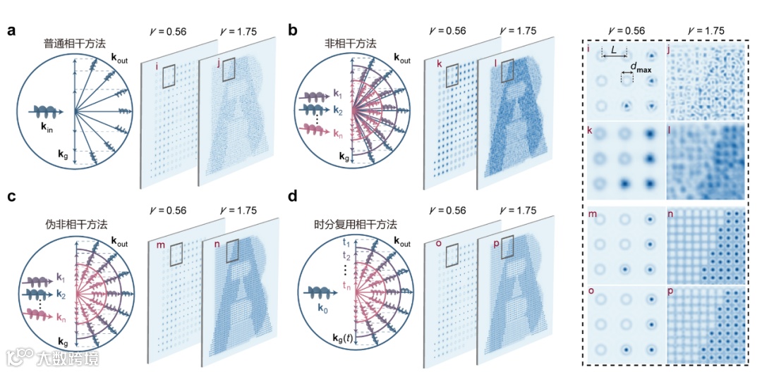 针对以上难题,清华大学精仪系先进激光技术团队建立了OAM全息复用串扰的综合分析模型,提出了几乎无串扰的伪非相干方法,并通过时分复用技术实现了近似的相干方法。新技术放宽了对OAM全息采样条件的限制(γ可增大数倍,如图1b的红色、紫色曲线所示),突破了现有OAM全息技术的分辨率上限,显著提升了重建图像的分辨率(相同复用通道数量下)和复用容量(相同分辨率下)。工作原理如图2所阐释:现有OAM全息技术对应于图2a的普通相干方法,当γ>1时,重建图像中的OAM特性被完全破坏,引起强烈的复用串扰;图2b的非相干方法虽然能够抑制复用串扰,但由于时域/空域色散,重建图像会变模糊;图2c和图2d分别为本工作提出的伪非相干方法、时分复用相干方法,使重建图像始终保持OAM特性,即使在超分辨情况下仍能获得高质量重建。