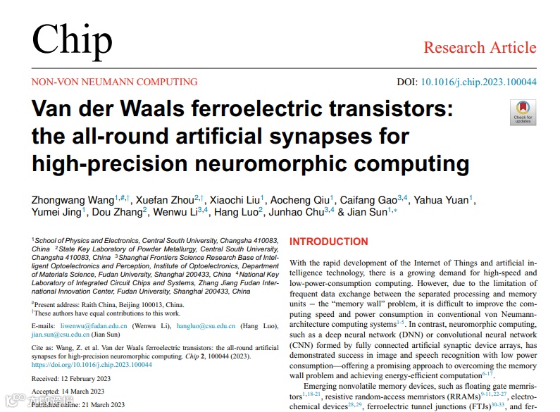 近日,中南大学孙健、罗行团队与复旦大学李文武团队合作以「Van der Waals ferroelectric transistors: the all-round artificial synapses for high-precision neuromorphic computing」¹为题在Chip上发表研究论文。该工作面向高精度神经形态计算开发了的各项性能均衡的范德华铁电晶体管人工突触器件。本文第一作者为王众望,通讯作者为罗行、李文武和孙健。Chip是全球唯一聚焦芯片类研究的综合性国际期刊,是入选了国家高起点新刊计划的「三类高质量论文」期刊之一。