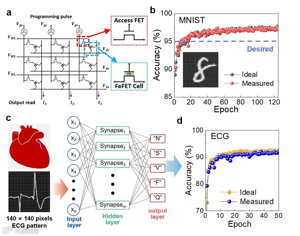 在相同栅极脉冲方案的调控下,vdW-FeFET表现出了极高线性(增强~0.016,抑制 ~0.013)和高对称性(0.003)的权重更新特性。研究团队在vdW-FeFET中展示了5个电导态的长达10年的存储非易失性以及大于100个周期的稳定操作。vdW-FeFET同时展示了其他关键的人工突触器件性能,即大于128个电导状态、小于10 fJ/脉冲的低操作功耗,小于5 V的操作电压。研究团队基于vdW-FeFET器件性能模拟了双层神经网络对于手写数字和心电图模式的识别(图2),分别获得了97.6%和92.4%的高精度。vdW-FeFET人工突触器件在各项器件指标都表现出了良好的均衡性能,是面向高精度神经形态计算的潜在硬件平台。