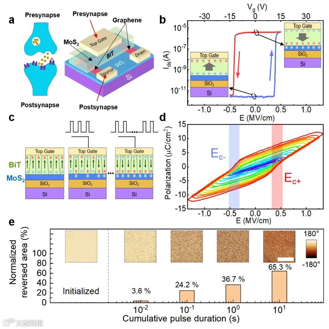 在这项研究中,研究团队利用范德华异质集成技术构筑了由单晶铁电纳米片、二维半导体通道和石墨烯范德华接触组成的全范德华结构vdW-FeFET人工突触器件(图1)。研究利用压电力探针技术展示了铁电单晶的多电畴结构在相同电压脉冲序列控制下极化逐步翻转的特性。