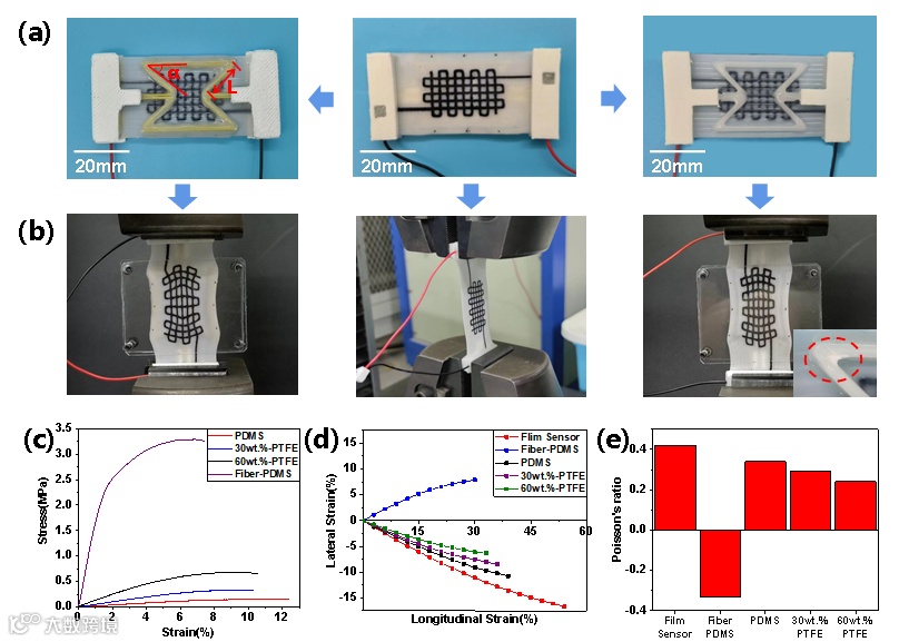 图2 ( a )为制备的纤维- PDMS拉胀传感器、薄膜传感器和PTFE - PDMS拉胀传感器;( b )传感器的拉伸过程;( c )负泊松比结构材料的力学性能;( d )薄膜传感器和拉胀传感器的侧向应变;( e )薄膜传感器和拉胀传感器在20 %应变下的泊松比。
