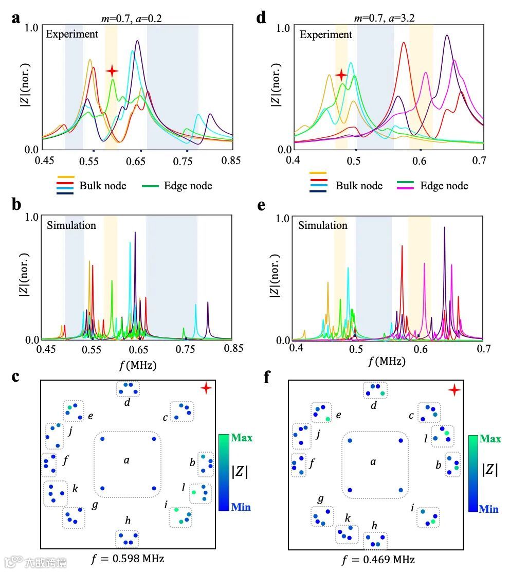 进一步,研究人员对具有部分开边界的双曲电路样品进行了实验测量。图4a和4d以及4b和4e分别对应实验测量和理论仿真的电路阻抗结果。可以看到双曲电路的边界格点在具有非零二阶(图4a和4b)以及一阶(图4d和4e)陈数的带隙区域具有显著的阻抗响应,而在平庸带隙没有阻抗峰值。图4c和4f进一步显示了边界态所对应频率下的电路阻抗分布图。可以清楚的看到,具有非零二阶和一阶陈数的双曲拓扑带隙中存在边界态,其空间分布与理论模型完全一致。