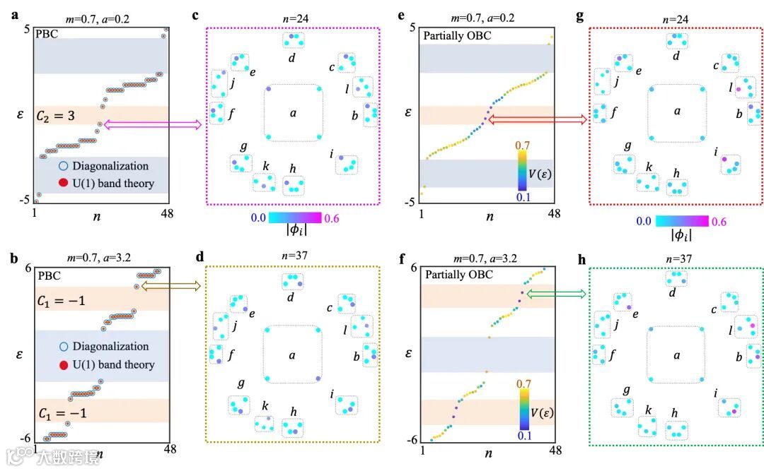 为了研究非平庸双曲晶格的边界态,研究人员构建了具有12个原包的有限双曲模型。12个原包的具体位置在图1a被字母标记(‘a’到‘l’)。图2a和2b显示的是利用直接对角化和双曲能带理论计算的有限周期双曲晶格的本征能谱。可以看到两者完全吻合,证明了双曲能带理论的有效性。具有非平庸二阶(图2a)和一阶(图2b)陈数的拓扑带隙用橘黄色的区域标记出来,而蓝色区域对应平庸带隙。图2c和2d分别显示了具有非平庸二阶和一阶陈数的有限双曲周期晶格的体模式分布图。为了观察双曲拓扑诱导的边界态,研究人员进一步构建了具有部分周期边界条件的双曲晶格模型,其本征能谱显示在图2e和2f中。可以清楚的看到,具有非零二阶(图2e)和一阶(图2f)陈数的带隙中出现了边界局域态,而平庸带隙中没有边界态产生。二阶和一阶陈数诱导的边界态空间分布显示在图2g和2e中。上述结果清晰的显示,具有非平庸二阶(和一阶)陈数的双曲带隙中存在双曲拓扑边界态。