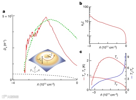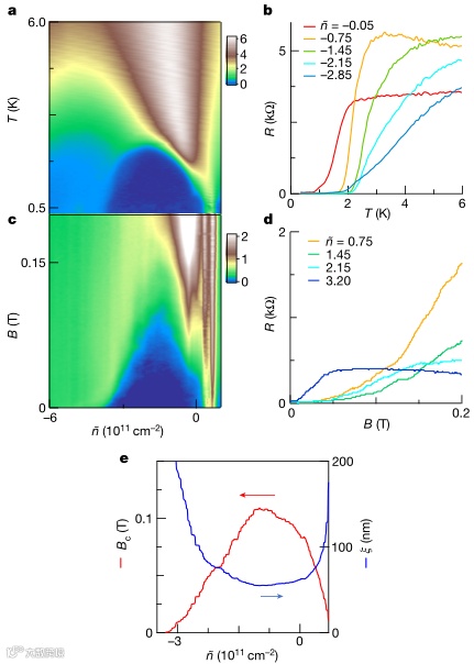 建立超平带后,接着作者关注了B=0处的输运数据。在−3.5<ñ<0.3×1011 cm−2处观察到超导现象。在2D中,超导跃迁为Berezinskii-Kosterlitz-Thouless跃迁,由临界温度Tc以上的涡-反涡对扩散驱动。类似地,对于B和ñ观察到超导穹窿,在最佳掺杂时,上临界磁场Bc2高达0.1T左右。从这些ξ值和速度测量,几个基本的BCS关系显然是无效的。所有这些无效的方程都表明,平带超导与传统的(BCS类)行为显著不同。
