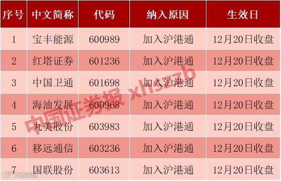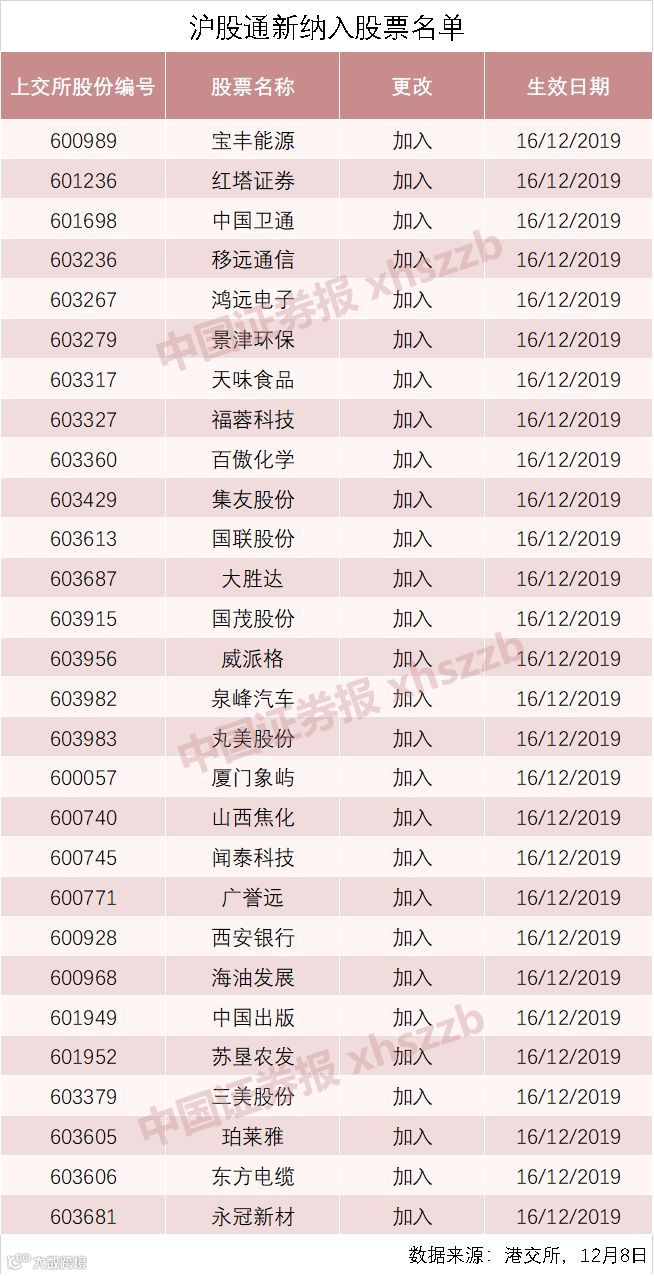 具体看,新纳入的个股包括宝丰能源、红塔证券、中国卫通等28只个股。此外,浙商银行A股于2019年11月26日于上交所上市及有相关H股在联交所上市及买卖。相关A股于上交所买卖满10个交易日后,即2019年12月10日,浙商银行将纳入沪股通。