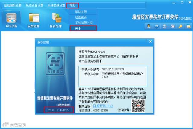 点击开票软件中帮助-关于查看软件版本是否已升级为最新版本V2.0.12_20161225,以免影响您正常的开票使用!