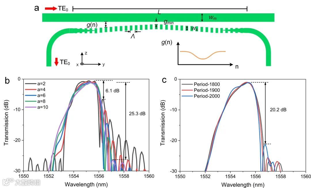 最近,兰州大学物理科学与技术学院田永辉教授课题组与合作者通过在薄膜铌酸锂晶圆表面沉积一层氮化硅,利用CMOS兼容的刻蚀技术仅仅刻蚀氮化硅层形成氮化硅-薄膜铌酸锂混合波导结构。合作团队基于这种混合波导引入了亚波长光栅和多模波导的耦合结构实现了低耦合损耗、高旁瓣抑制比的GACDC。作为该结构的一个应用实例,合作团队级联多个GACDC构建了一个波分复用/解复用器,其信道间隔达到创纪录的3.2 nm(400 GHz)。相关结果在线发表在Laser & Photonics Reviews上。