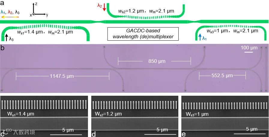图2 (a)基于GACDC的波分复用/解复用器结构示意图,(b)波分复用/解复用器的显微图,(c)ws1=1.4 μm时耦合区域的SEM图,(d)ws2=1.2 μm时耦合区域的SEM图,(e)ws3=1 μm时耦合区域的SEM图。
