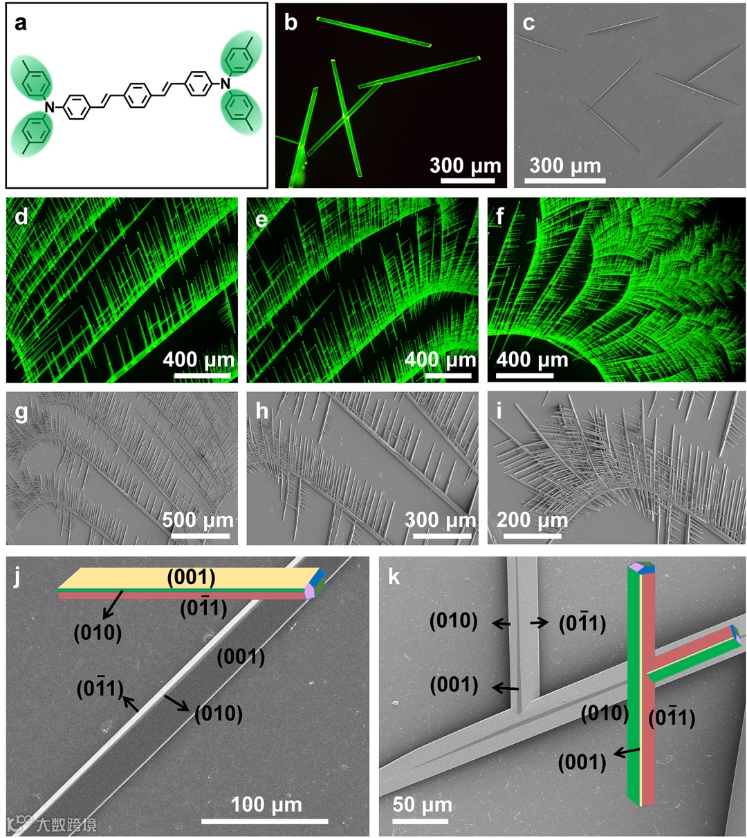 图1.(a)模型化合物OPV-A分子结构。(b,c)未分枝和(d-i)多级分枝的OPV-A微米线形貌。(j)未分枝和(k)分枝OPV-A微米线的晶面归属。