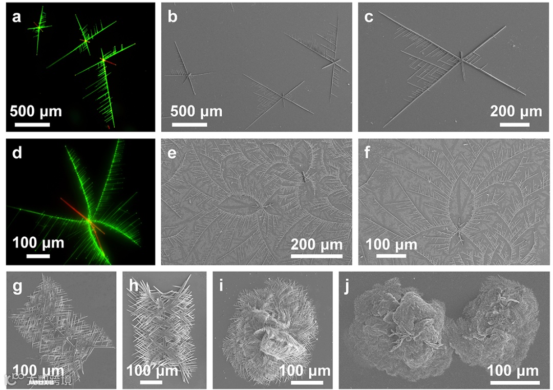 图2.晶种诱导实现(a-f)单点和(g-j)多点OPV-A微米线可控异质外延生长。