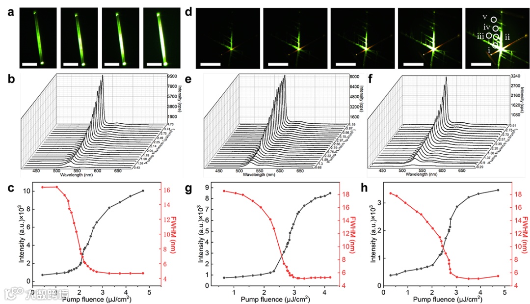 图3.单一未分枝微米线及阵列型异质分枝微米线不同位点的ASE性能研究。