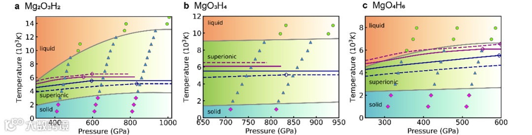 他们用自主开发的基于机器学习和图论辅助的晶体结构搜索方法(MAGUS),结合第一性原理计算,对高压下的镁-氧-氢三元化合物的晶体结构,以及它们在高温高压下的物态进行了系统研究,预测了三种在高压下稳定的镁-氧-氢三元化合物,其组分为