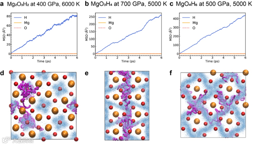 (270-600 GPa)。随后,他们使用第一性原理分子动力学和机器学习分子动力学详细研究了这些化合物在高温高压下的动力学行为,并构建了温度压强相图。模拟结果表明,随着温度升高,三种化合物均有从固态到超离子态再到液态的相变。在镁-氧-氢体系中,超离子态表现为镁-氧框架保持固体行为,而氢则可以像液体一样自由扩散(图1)。将镁-氧-氢三元化合物相图与目前的行星模型对比,发现氧化镁-水化合物的超离子态区间涵盖了天王星和海王星内部的温度压强范围(图2),说明它们很可能在行星内部大量存在 。