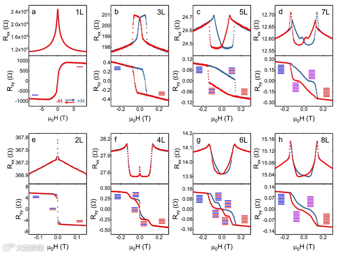 图2. 各种层数的纳米器件中的霍尔电阻和磁阻