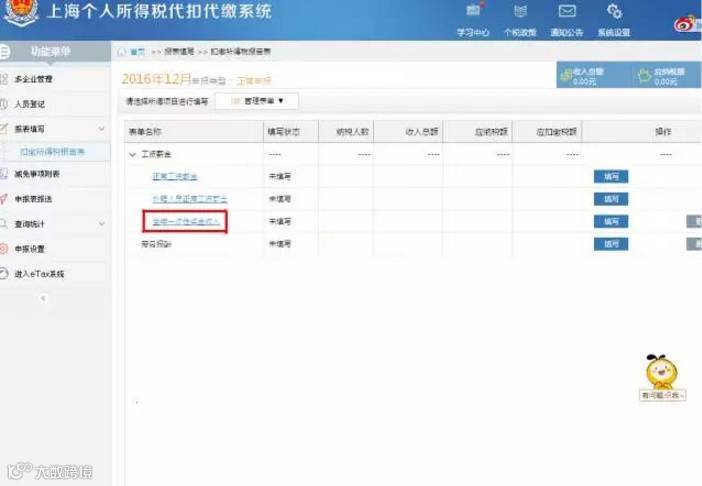 打开“金税三期个人所得税扣缴系统”,点开“报表填写”,“扣缴所得税报告表”,显示一系列的“工资薪金”申报表,选择“全年一次性奖金收入”申报表,“填写”即可。