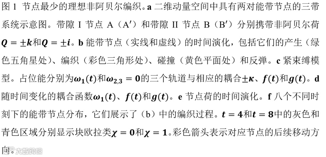 最近,人们理论预测了超越上述阿贝尔分类的对称保护拓扑相。由于多个带隙纠缠在一起,潜在的新范式由非阿贝尔群描述。多带隙拓扑结构表现出引人注目的非阿贝尔编织结构,并反映了一种全新的能带拓扑类型。能量-动量空间中的编织可以用非阿贝尔拓扑荷描述。例如,PT或C2VT对称的三带系统可拥有实值哈密顿量,其希尔伯特空间中的三个实本征态构成了标准正交坐标系,相应本征态沿闭合路径的轨迹为系统定义了非阿贝尔系电荷。根据同伦群理论,这些拓扑荷与旗帜类SO(3)/D2
