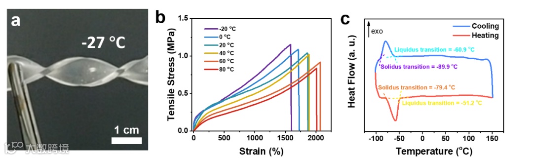 合成高分子水凝胶机械性能差的问题严重阻碍了其应用,为此人们提出了很多改进策略,设计制备了许多高强度水凝胶。这些凝胶的某些指标甚至已大大超过了生物凝胶。但这些凝胶在某些性能得到改进的同时,另一性能往往差强人意。例如双网络水凝胶具有良好的韧性和延展性,但可回复性(resilience)往往较差。此外水凝胶还存在失水和低温结冰的问题。设计合成同时具备高韧性、高延展性、高回弹性、高粘性、抗冻、抗干等性能的综合性能优异的凝胶材料仍是一个巨大挑战。
