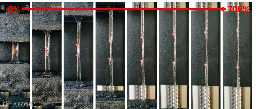 (4)裂纹不敏感。在2.5mm长切口存在条件下断裂伸长率仍达730%。断裂韧性(fracture toughness)高达13,600 Jm−2, 是单网络凝胶最高值。