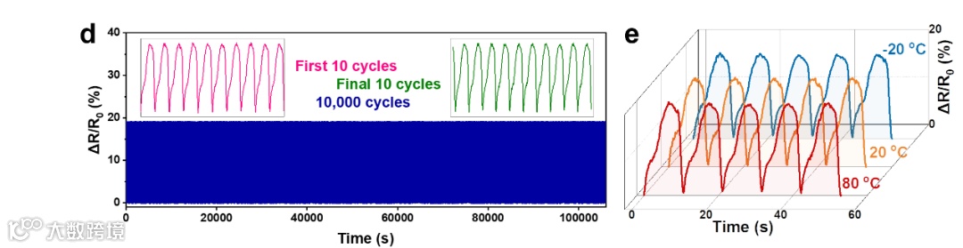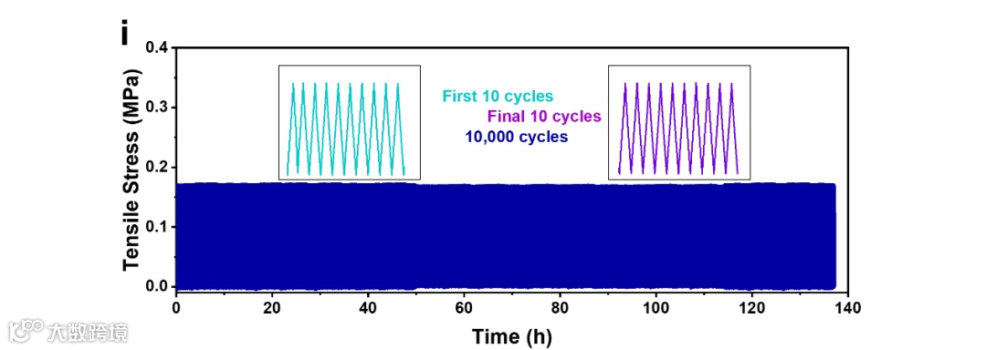 由于凝胶的高回复性和高环境稳定性,该凝胶在进行耗时长达137小时(5.7天)、连续1万次加载-卸载循环拉伸测试中信号高度稳定: