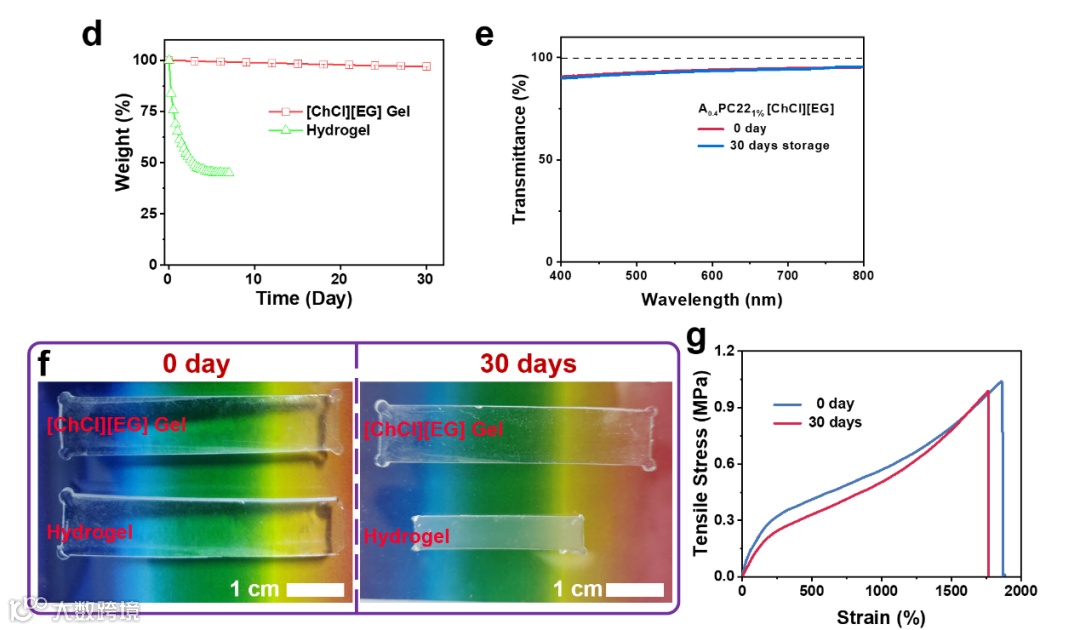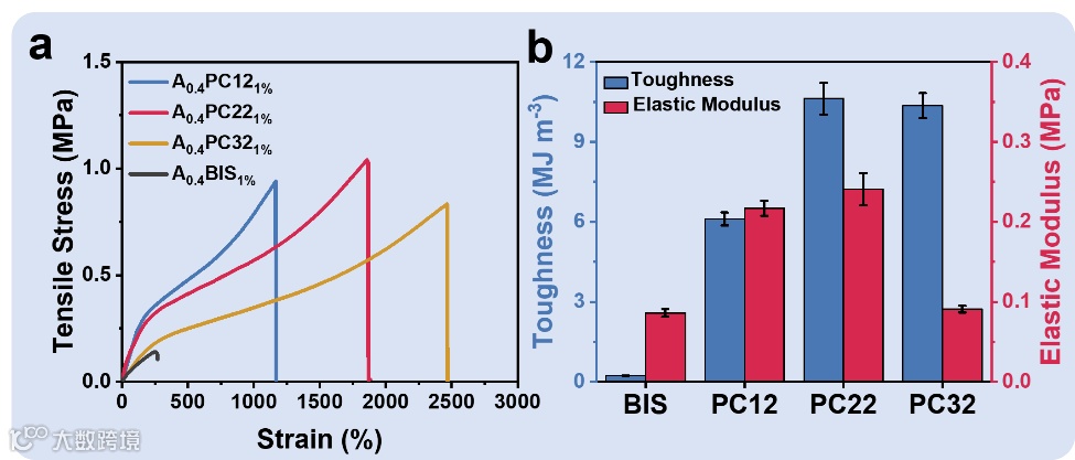 (1)高韧性和高延展性。以A0.4PC221%[ChCl][EG]凝胶为例,其韧性(toughness)达10.6MJm−3 ,比BIS交联凝胶增加45倍。断裂伸长率达1860%,比BIS交联凝胶增加6倍。
