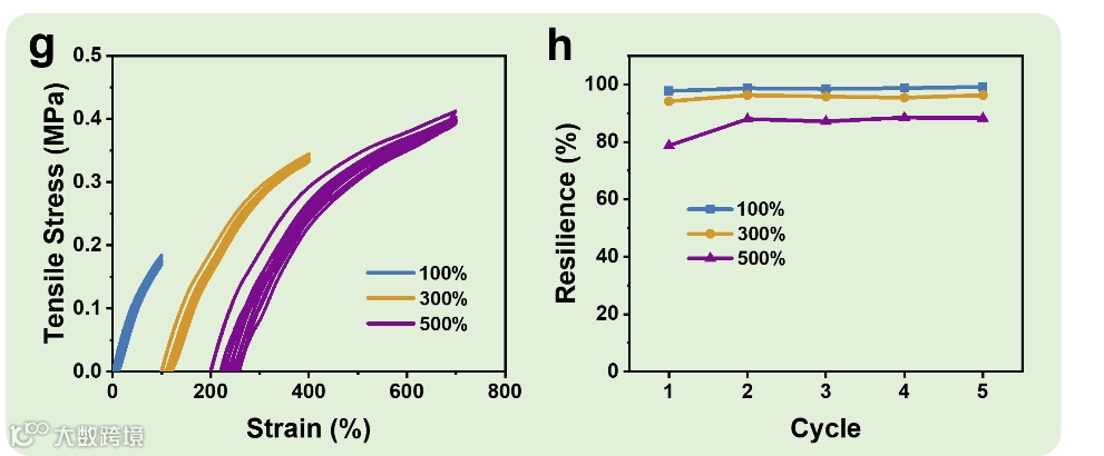 (2)高可回复性(resilience)。由于其其独特的能量耗散机制,与普通增强机制不同,多肽增强凝胶在提高韧性的同时仍能保持高可回复性,其Resilience高达99.1% (100% strain)。