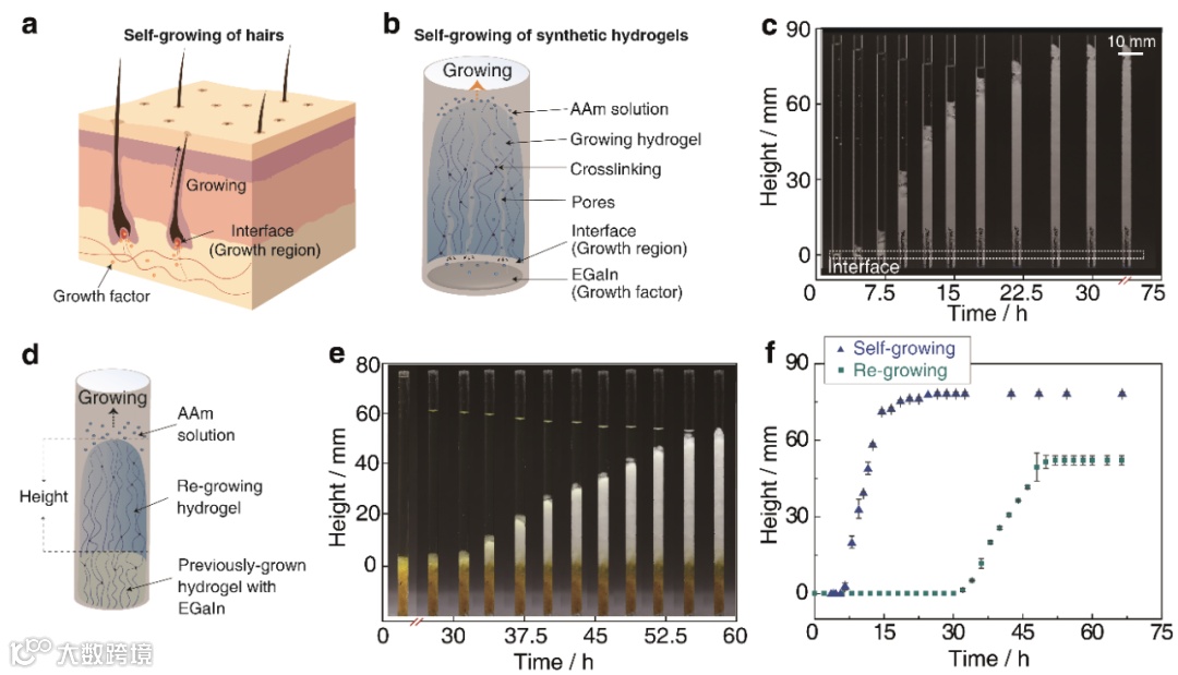 受角质蛋白自生长行为的启发,该团队提出了液态金属和水性单体溶液界面处的连续自由基聚合策略,并实现了水凝胶的自生长和再生长(图1)。团队以丙烯酰胺(AAm)单体为例,液态金属镓铟合金(EGaIn)作为引发剂,EGaIn-AAm水溶液界面处可以连续产生自由基,引发界面处单体聚合,生成PAAm水凝胶;于此同时,EGaIn与水反应生成氢气,在PAAm水凝胶形成气孔,降低水凝胶密度,从而促进生长出的PAAm水凝胶向上移动,并在界面处生长出新的PAAm水凝胶,类似于指甲和头发处角质蛋白的自生长现象。