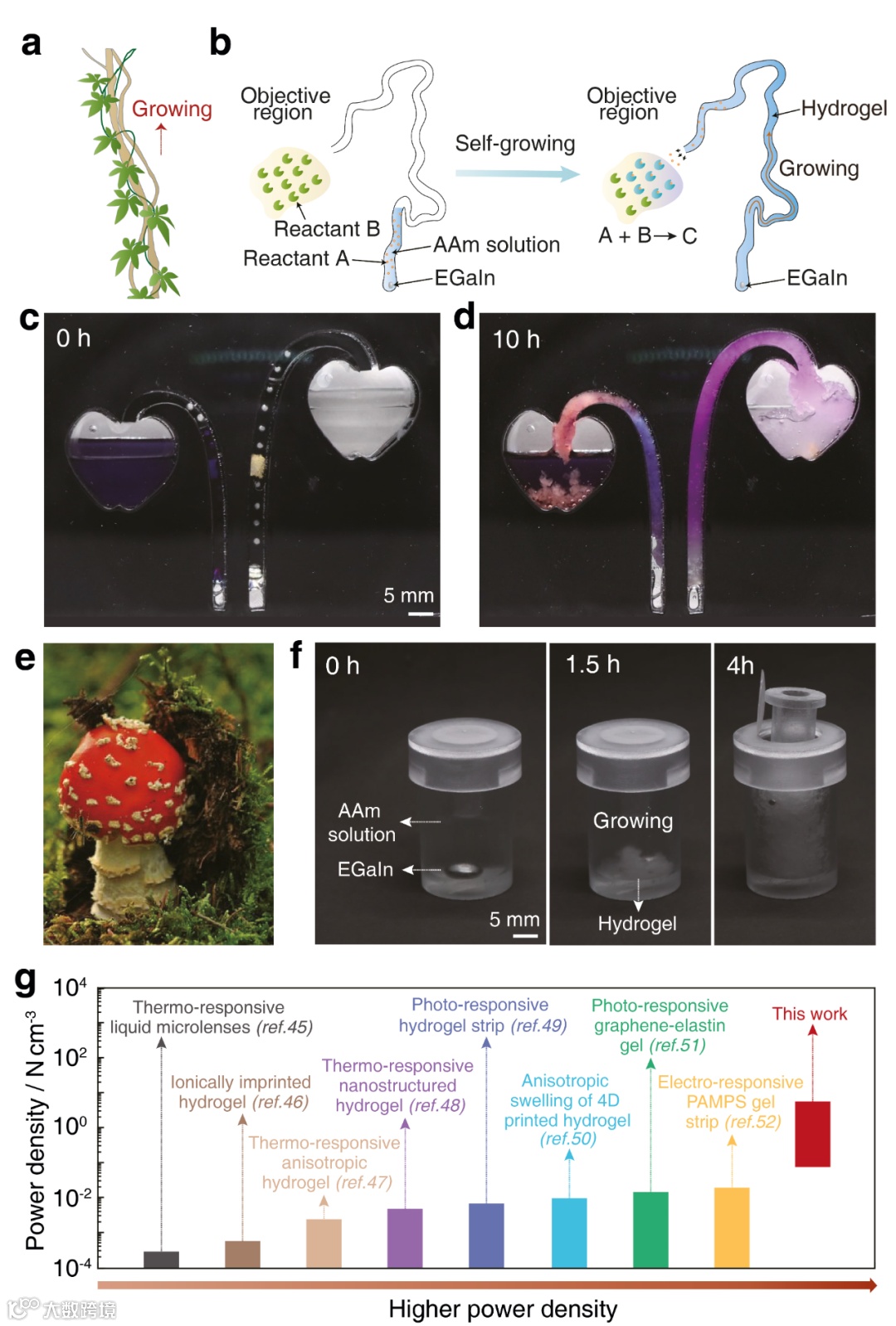 受这种自然植物“破土而出”启发,该团队将上述自生长的“动力”转化为“驱动力”,设计了一种基于自生长水凝胶的高效致动器(图2e-f),成功将一特定容器打开(约需53N)。现阶段,大部分水凝胶致动器通常需要光/热/电等外界能量触发,该团队研发的高含水量自生长水凝胶(71.5 wt.%)不需要输入任何额外能量的输入,而且功率密度(单位体积的驱动力)显著高于已报道水凝胶类致动器。基于此,这些自生长水凝胶易于使用、可控、高效,特别适合用于微型设备或自发致动器。