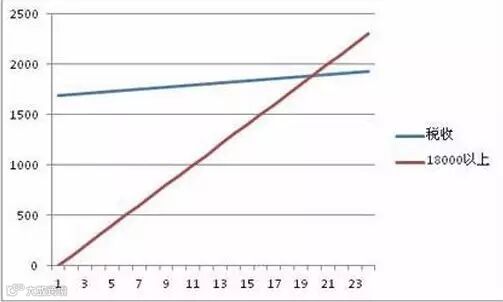红线表示18000元以上的年终奖部分,蓝线表示税收。在红蓝线形成的三角区域,就是税收比18000元以上的年终奖还要高的部分。这个三角区域其实就是我们要避税的部分。两线相交就是在年终奖19283.33元时。