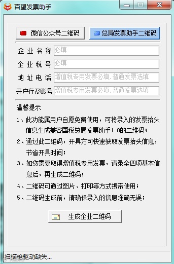 如您需取得增值税普通发票,企业名称、企业税号为必填项,地址电话、开户行及账号为非必填项;如您需取得增值税专用发票,请填写全四项基本信息后,再生成二维码。