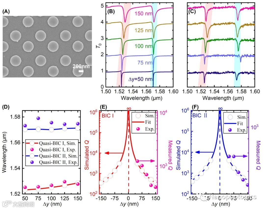 (1) 复合晶格的中心颗粒位移可以诱发SLR杂化形成的双频BIC。将颗粒尺寸完全相同的两个晶格错位复合,使得等效单元的中心颗粒发生相对位移(见图1),由此打破结构单元的面内对称性,可以分别实现两个晶格中面内电四偶极SLR和面外磁偶极SLR各自的杂化,从而获得双频BIC。通过微纳加工,进行了实验验证,并且测得了高达1240的Q值(见图2)。