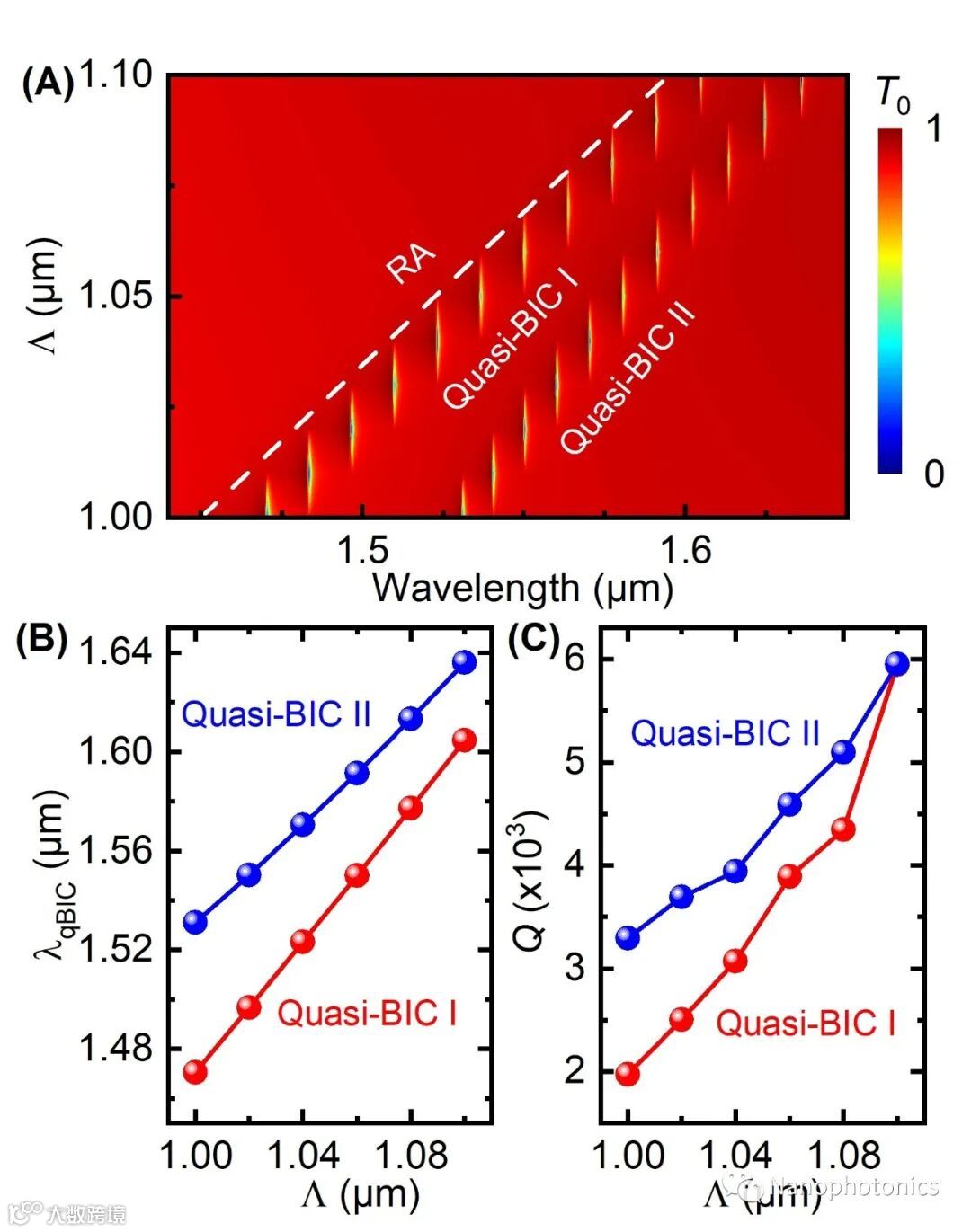 图4 改变阵列周期,可以调节双频准BIC的共振波长和Q值