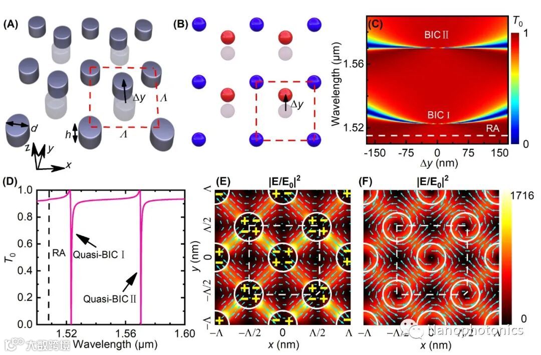 图1 基于中心颗粒位移的晶格杂化结构,分别利用面内电四偶极SLR和面外磁偶极SLR各自的杂化,实现了双频BIC。