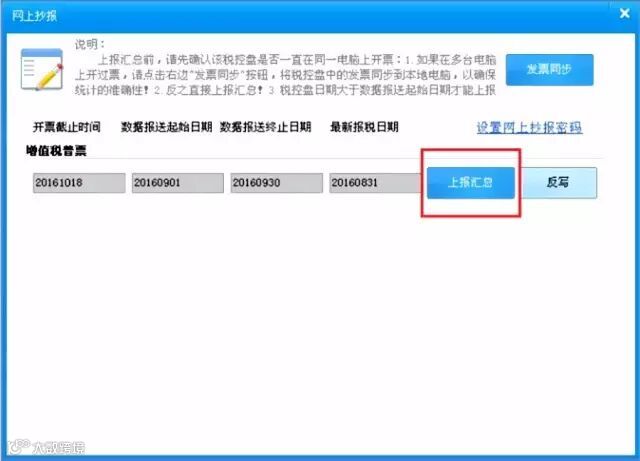第二步:点击【上报汇总】,向税务机关提交开票数据,初次点击上报汇总的时候会提示让设置网上抄报的密码,建议设置为88888888,以后再抄报,就无需再输入了。
