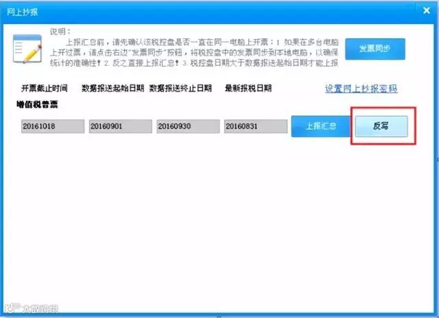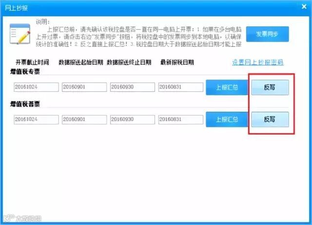 第四步:【反写】,第三步操作成功之后,打开开票软件,点击报税处理——网上抄报,统一点击【反写】,都多少种发票,就点击多少次【反写】,同样的,主分机也是一样的操作,所有的发票都反写成功,那么本开票机就完税成功。