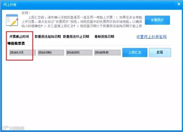 提醒:因开票软件有自动反写的功能,如您打开【网上抄报】发现开票截止时间已经是11月,那么就无需操作反写了。