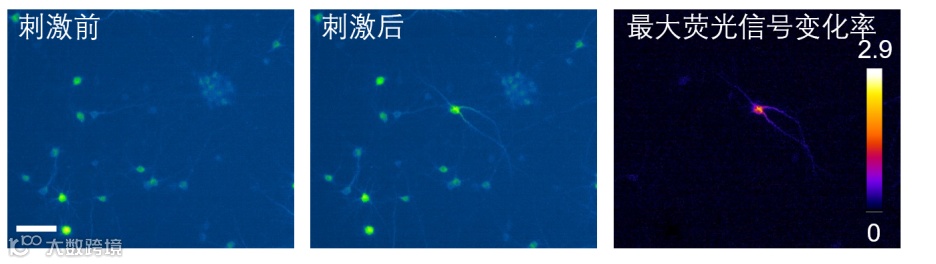 图2.光致超声经颅刺激体外神经元细胞的钙离子荧光成像。比例尺:50微米。