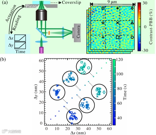 图1:利用基片形貌的光学指纹,实现基片横向位移的无标记监测,精度可达0.22 nm | 图源:Physical Review Letters