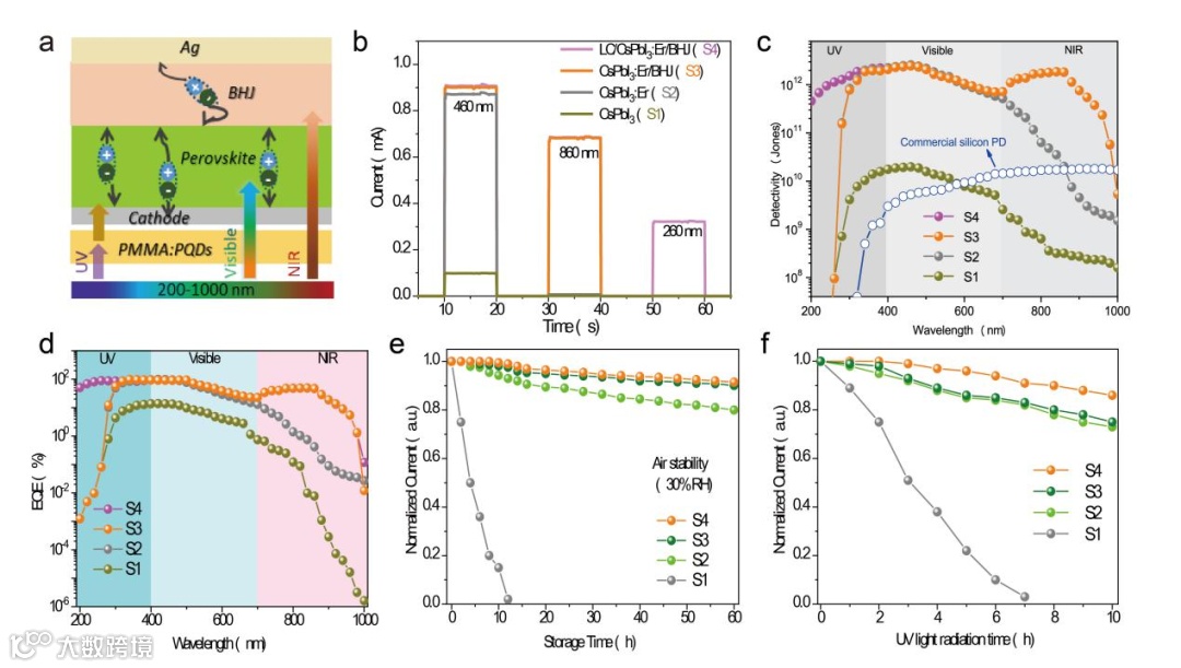 图2 (a)宽带探测器电荷传递机理示意图。(b) ITO / ETL / CsPbI3 / Ag (S1), ITO / ETL / CsPbI3:Er3+ (7.7%) PQDs / Ag (S2), ITO / ETL / CsPbI3:Er3+ (7.7%) PQDs / BHJ / Ag (S3) 和 Cr/Ce/Mn-LC / ITO / ETL / CsPbI3:Er3+ (7.7%) PQDs / BHJ / Ag (S4) 探测器在260 nm, 460 nm, 和 860 nm光电流。(c)S1-S4探测器和Si探测器的探测性能。(d)S1-S4探测器外量子效率。(e-f)S1-S4探测器长时稳定性和紫外光照稳定性。