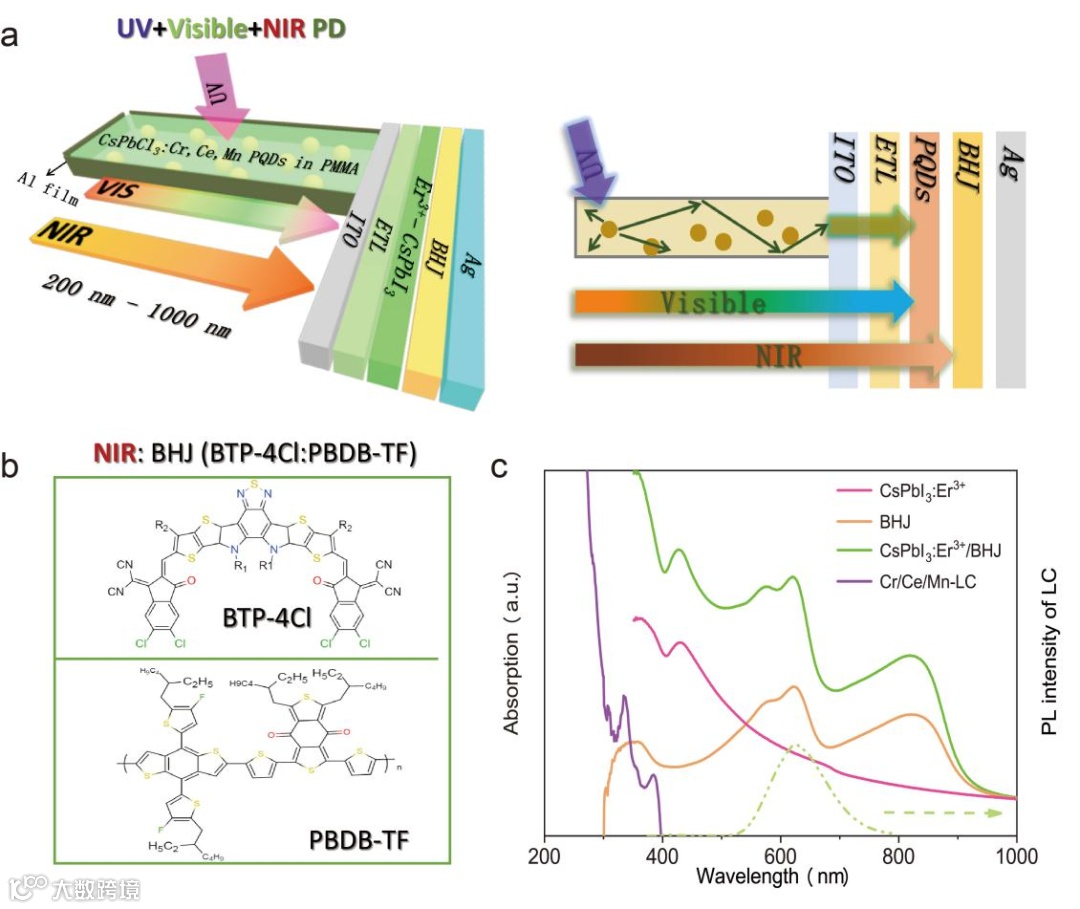 团队通过创新性提出基于CsPbCl3:Cr3+,Ce3+,Mn2+ 钙钛矿量子点(PQDs)聚光器(紫外光转换可见光),Er3+ 掺杂CsPbl3 PQDs,有机异质结PBDB-TF:BTP-4Cl (BHJ),实现从深紫外到近红外(200-1000 nm)高效响应,高稳定性的宽带光电探测器(PDs)。