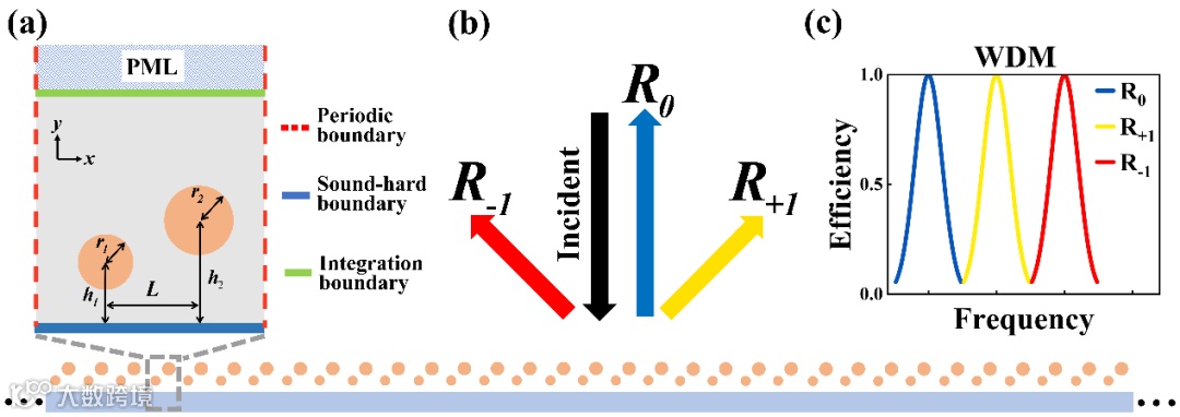 图1 基于声学超格栅的波分复用(WDM)器件。(a)超格栅结构简单:原胞由2个刚性圆柱构成,背景为空气。(b)超格栅的WDM功能示意图:不同频率(波长)的入射声波被反射到不同的方向。(c) 超格栅的衍射谱线示意图:从低频到高频,不同频率的声波被依次反射到R0(蓝色箭头)、R1(黄色)、R-1(红色)三个通道中,且峰值反射率达100%,从而实现波分复用功能。