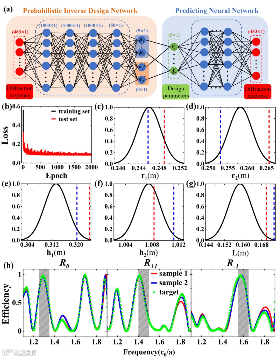 图4 概率性预测模型的结果。(a)变分自编码器(Variational AutoEncoder,即VAE)的框架:左侧为概率性逆向网络(probabilistic inverse design network),右侧为正向预测网络(PNN)。(b)VAE的学习曲线。(c)-(g) 五个设计参数的高斯分布,红色和蓝色虚线表示从高斯分布中随机采样的两组设计参数。(h) 随机采样的两组设计参数的衍射响应与目标衍射响应的比较,展示了设计参数的灵活性和敏感性。