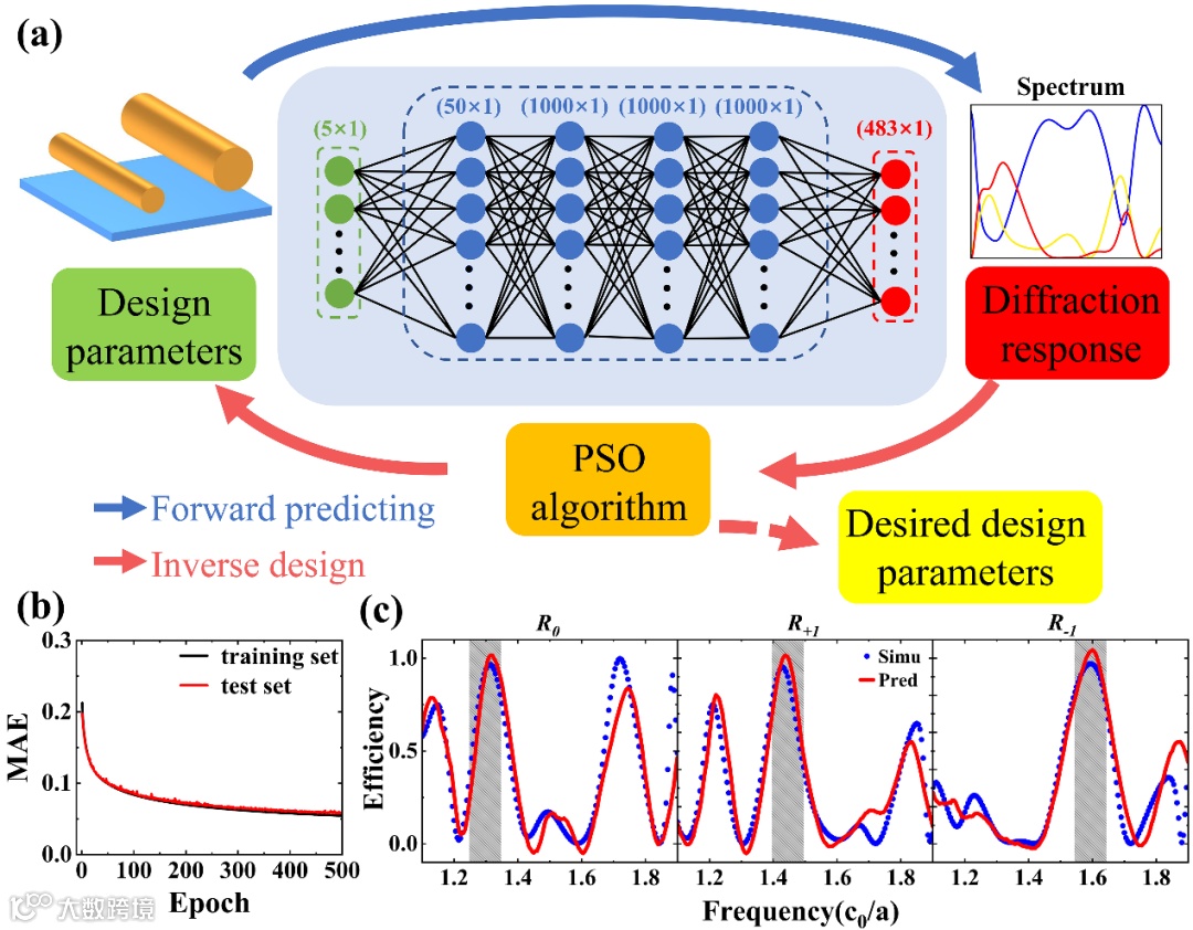 图2 超格栅的逆向设计。(a) “PNN+PSO”架构的逆向设计原理。上部分为正向预测神经网络(PNN),它能从超格栅的设计参数准确地预测其衍射响应。下部分为粒子群优化算法(PSO),它通过筛选PNN的输出结果(衍射响应),以迭代的方式更新PNN的输入(设计参数),直至找到最优解。(b)PNN的学习曲线。(c)第一代“PNN+PSO”架构的逆向设计结果。红色实线和蓝色点线分别代表PNN预测的,以及数值仿真的(即真实的)、、等3个通道的衍射谱线。阴影部分表示事先给定的WDM频率范围:在该频率范围内特定衍射阶的效率需达到100%。