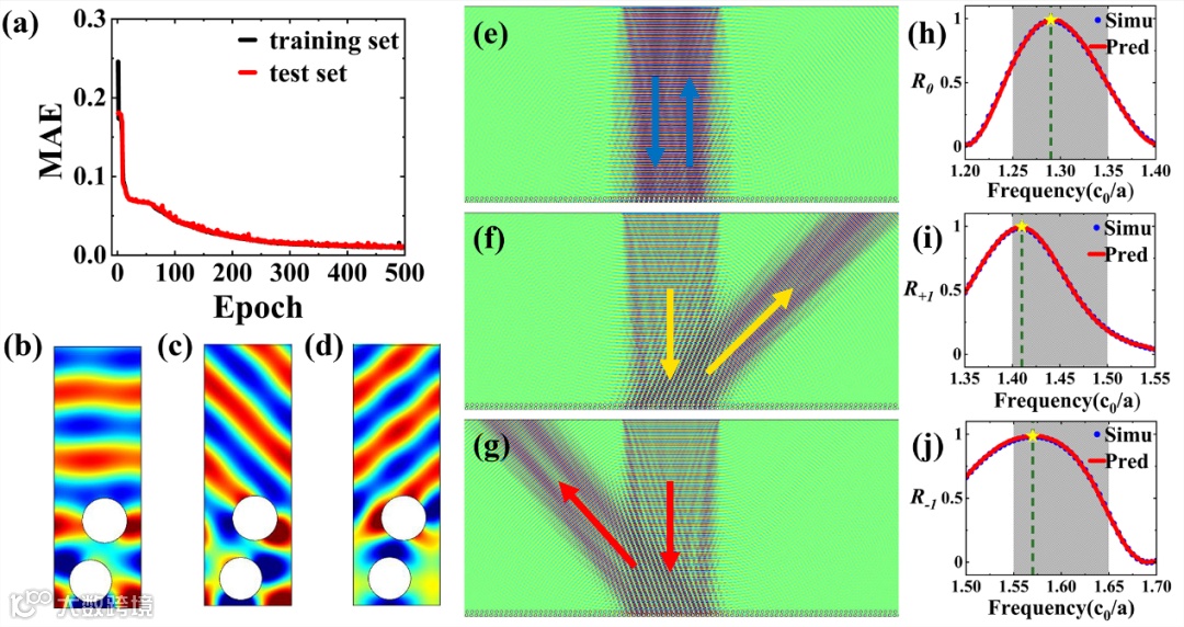 图3 第二代PNN+PSO架构的逆向设计结果。(a)第二代PNN的学习曲线:通过高质量数据的学习和训练,进一步改善了逆向设计本领,提升了波场超控效能。(b)-(d)不同波长的正入射声波被分别反射到、、等3个通道时的声散射场图。(e)-(g)为相应的总声场图,验证了WDM功能。(h)-(j)为、、等3个衍射阶的谱线:红色实线为PNN预测谱线,蓝色点线为仿真谱线,两者完全重合。