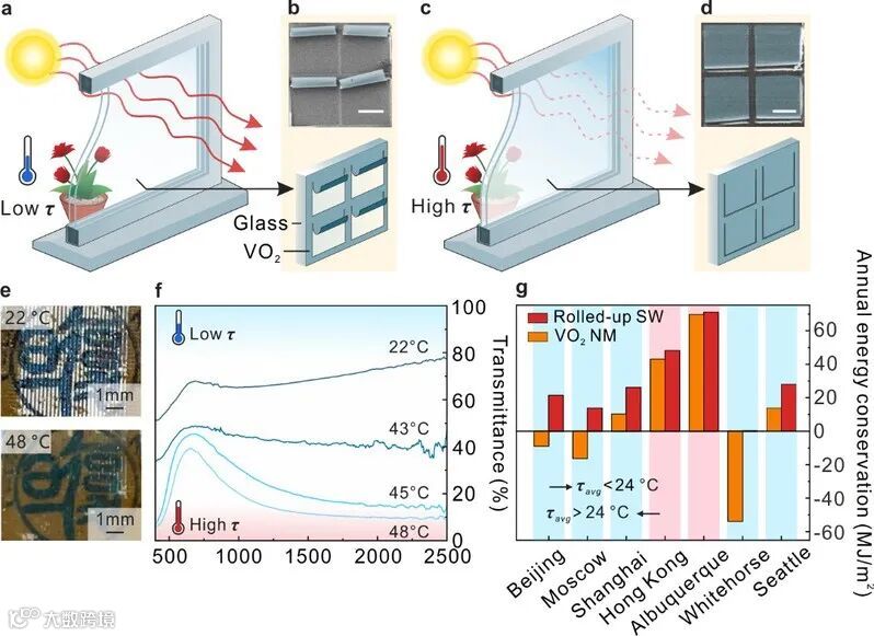 建筑物能源利用效率的优化在很大程度上主导了现代城市可持续发展的进程,其中建筑物的照明、供暖和空调等能源系统占据了全球能源消耗的约40%,很多建筑物的能量会因为建筑窗户与外界热交换而大量浪费掉。因此,如何通过窗户的智能化实现太阳光的调制是建筑物热能高效利用的一项挑战。由环境温度变化引起自身物理性质变化的二氧化钒材料(VO2)成为实现窗户智能化的重要手段之一。作为无需人工干预的自响应智能窗,它可以保持可见光不变,仅仅随温度变化调节近红外区域太阳光透射,实现低温多透光,高温少透光。但是,二氧化钒材料的可见光透过率较低,红外热能的调控也同步减弱,能源管理效率的进一步提高受到材料物理特性的制约。