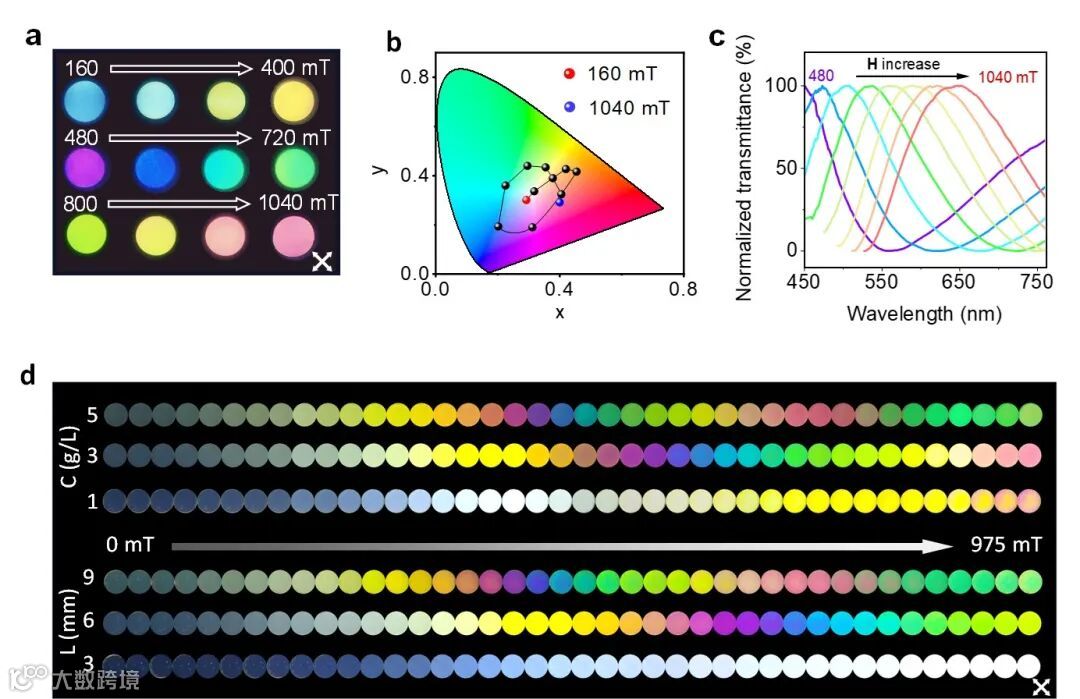 研究人员首先通过离子插层法制备了二维钴掺杂氧化钛液晶,而后在磁场下调控二维无机液晶分子的有序排列,再利用原位光聚合反应将各向异性引入水凝胶中。由于二维钴掺杂氧化钛液晶具有巨磁致双折射效应,故水凝胶制备过程所需的磁场强度较低(<1 T),并且水凝胶的双折射达到10-4,比现有报道值大一个数量级以上。这一大双折射可实现干涉色的宽光谱覆盖,且不同的干涉色可通过控制磁场、二维无机材料液晶浓度、光程及机械应力等多种参量进行调控,调控方法的多样性及颜色的丰富性使得此类水凝胶的个性化光学应用成为可能。基于这种各向异性水凝胶,研究人员制造并演示了一系列光学原型器件,包括光学相位延迟器、梯度光学衰减器、磁性透明彩色成像仪和可视化应力及温度探测器等,这为偏振光学领域的诸多应用如定制化光学元件、视觉增强设备、防伪标签等提供了新思路。