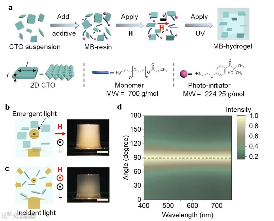 针对以上挑战,清华大学深圳国际研究生院刘碧录副教授团队利用磁场控制二维钴掺杂氧化钛液晶的取向,制备出一种具有大双折射值的光学各向异性水凝胶。这种磁场控制方法具有无损、高度均匀等优点,可实现各向异性的精确调控。同时,得益于二维结构极大的几何径厚比及磁化率各向异性,二维钴掺杂氧化钛液晶具有灵敏的磁响应,在小磁场下可高度有序排列,从而赋予水凝胶较大的双折射。