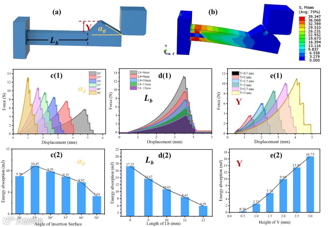 图3 影响卡扣力学性能的主要因素。(a)-(e)卡扣尺寸参数对卡扣装配力和能量吸收的影响。(a)卡扣结构的3D CAD模型,插入面角(α0)、梁的长度(Lb)、根切深度(Y)分别用黄色、黑色和红色标出。(b)卡扣结构在装配时的应力分布云图。c(1)-(2)不同插入面角下(20°-50°)卡扣装配的力-位移曲线和能量吸收情况。d(1)-(2)不同的梁的长度(Lb)对卡扣装配力和能量吸收的影响;e(1)-(2)不同的根切深度(Y)对卡扣装配力和能量吸收的影响。
