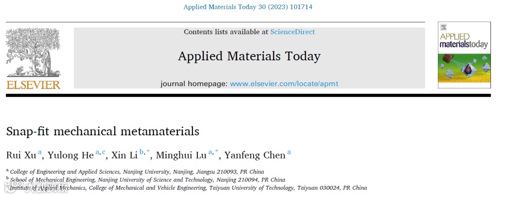 R. Xu, Y. He, X. Li, et al. Snap-fit mechanical metamaterials[J]. Applied Materials Today, 2023, 30.