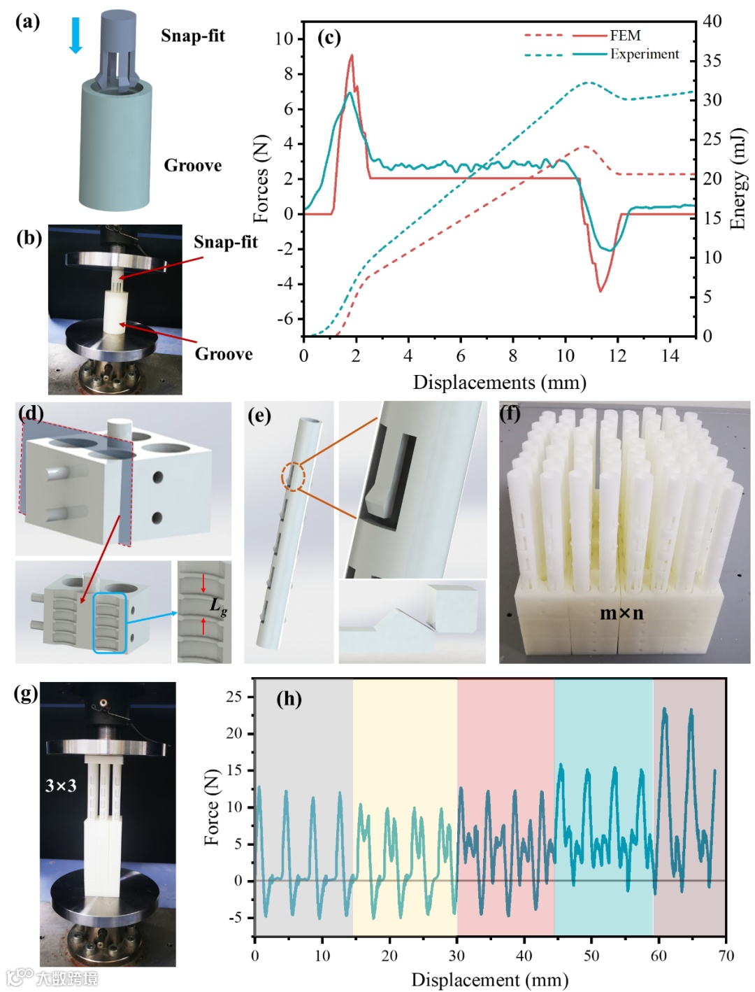 图4 多稳态力学超构材料设计与装配及其力学性能研究。(a)-(c)四爪卡扣的力学加载的实验和有限元仿真结果。(a)卡扣结构的3D CAD结构。(b)用万能试验机测试卡扣结构的力学响应的光学照片。(c)卡扣结构加载的实验和有限元仿真力-位移曲线。(d)-(f)多稳态力学超构材料设计与装配。(d)卡槽单元和剖分图,每个卡槽单元上带有插销和插孔,可以组装成大的卡槽结构,每个卡槽单元由4个多稳态腔组成。(e)卡扣单元,圆管形卡扣单元两侧排列着卡扣。(f)多稳态力学超构材料,由m×n个卡扣单元和卡槽结构组成。(g)-(h)用万能试验机测试3×3个卡扣单元和卡槽结构组成的多稳态力学超构材料的力学响应。(g)万能试验机测试的光学照片。(h)多稳态力学超构材料加载的力-位移(实线)和能量(虚线)曲线。
