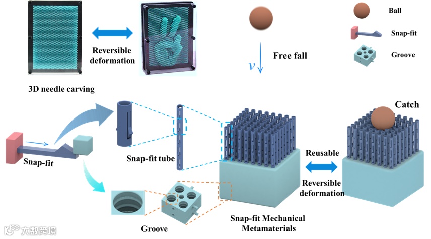 图1 卡扣力学超构材料设计策略:3D针雕可以展示出丰富的3D形状(左上,“是”手势),且变形是可逆的。受到3D针雕的启发,设计了基于卡扣的多稳态力学超构材料(卡扣力学超构材料)。卡扣力学超构材料由模块化的卡扣圆管和卡槽组成,分别对应卡扣单元中的卡扣和卡槽。左下方是卡扣圆管和卡槽的放大细节。通过3D打印制备卡扣和卡槽单元,再将它们组装成多稳态力学超构材料。这些卡扣力学超构材料在受到冲击载荷时可以吸收冲击能量,可以重复使用。小球从空中自由落体,下落到卡扣力学超构材料上。卡扣力学超构材料可以吸收小球的冲击能量,并抓住小球,阻止它反弹。由于超材料是模块化设计,因此可以适应复杂的环境和不同的应用场景。卡扣力学超构材料的可编程和可重新配置特性,可以用于不同的非平面目标的防护。此外,卡扣力学超构材料还表现出优异的抗冲击性和回弹能量的降低。因此,它们在减震器(如防撞护栏、头盔和汽车保险杠)的开发中发挥重要作用,可以安全地保护人体或货物免受冲击。